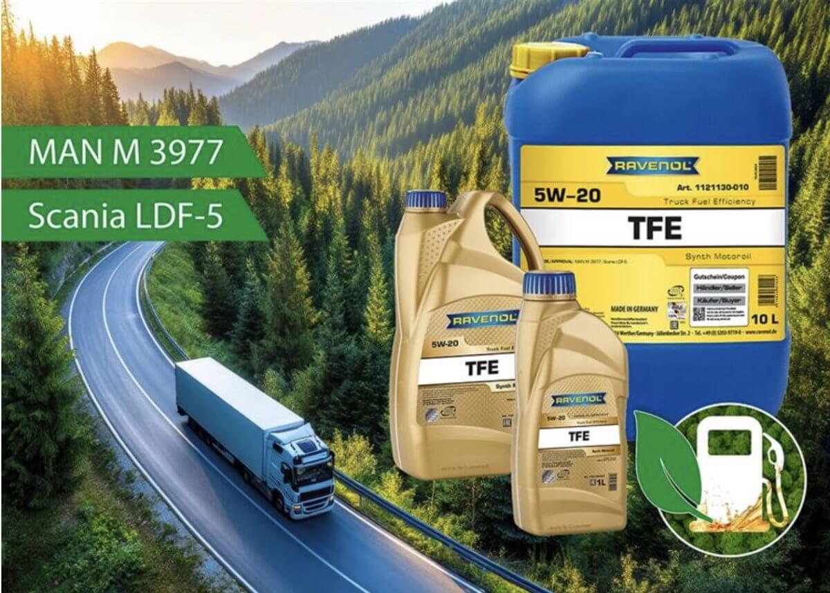 Mit dem neuen RAVENOL TFE Truck Fuel Efficiency SAE 5W-20 erweitert RAVENOL sein Portfolio um ein hochmodernes Hochleistungs-Dieselmotorenöl, welches speziell für die neuesten LKW-Motoren von MAN und Scania entwickelt wurde.