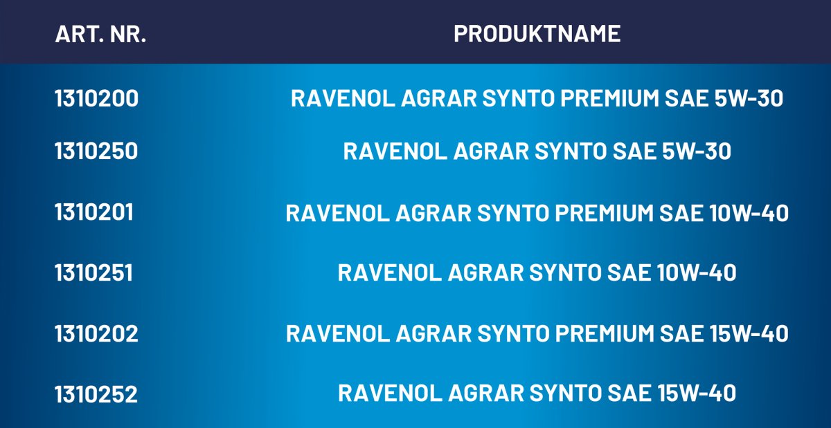 Die jeweiligen -für Agrarbetriebe optimierten- Produkte, sind schnell und eindeutig an unserem neuen Agrar Synto Logo zu erkennen. Weiterführend werden auch die Etiketten von RAVENOL UTTO, STOU und anderen Agrar-Produkten, schrittweise mit diesem Logo versehen.