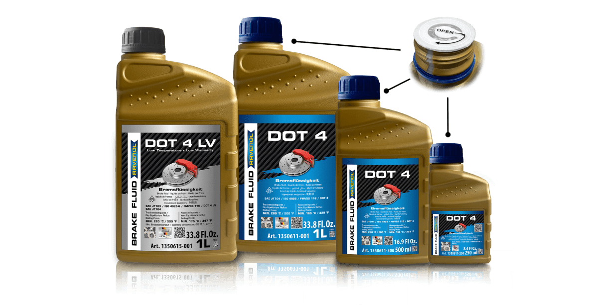 Discover our new golden plastic containers, which now fit even better in your hand. The airtight seal on the new containers now features a practical tab that makes it easier to open and pour the brake fluid. For better differentiation between brake fluids, the caps are also designed in the respective label color.
