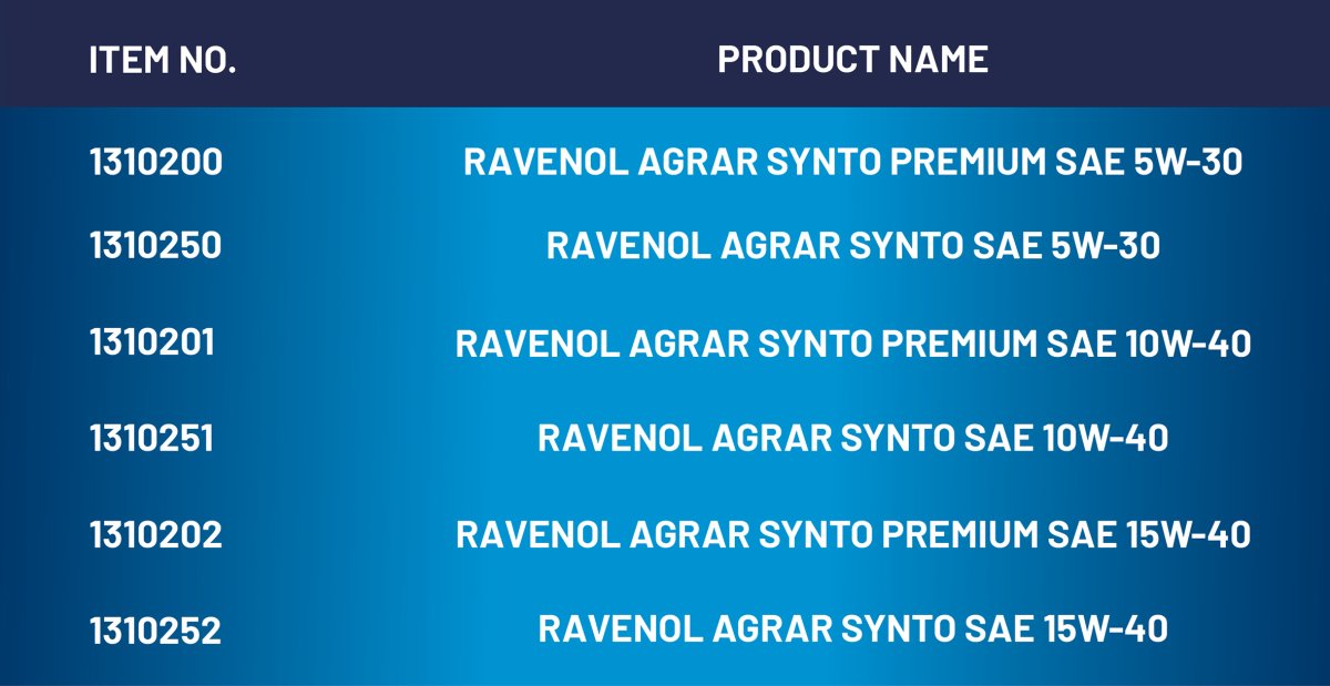 The individual products -optimized for the needs of agricultural companies- can be quickly and clearly identified by our new Agrar Synto Logo. Furthermore, the labels of RAVENOL UTTO, STOU, and other agricultural products will also gradually be equipped with this logo.