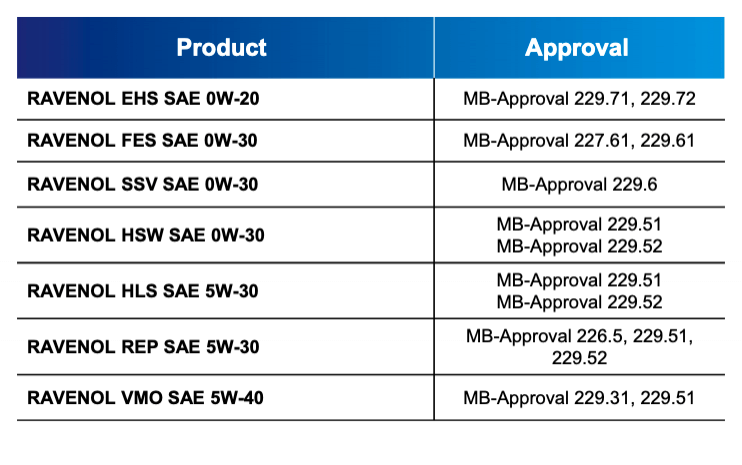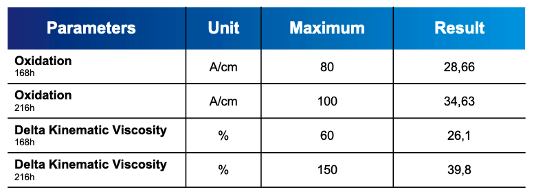 Das Bild kann nicht angezeigt werden. Here we see the supreme oxidation performance and cleanness of our product in presence of biodiesel. The oxidation and thickening at 168h check point are 2,8 times and 2,9 times respectively away from the limit. More severe check at the 216h shown similar picture. The oxidation and thickening at 216h (EOT) check point are 2,3 times and 3,8 times respectively away from the limit. The products that was developed to deal with malicious effect of the biodiesel are listed below with corresponding approvals by Mercedes.